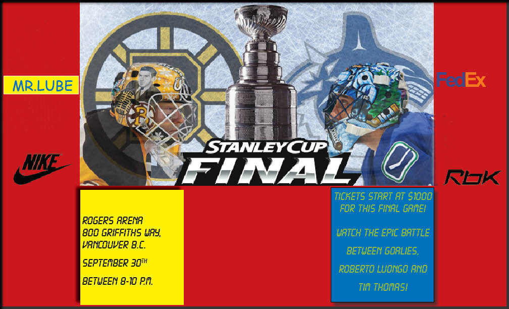 "The National Hockey League" invites you to attend the 2011 NHL Playoffs. This is the final game between the Vancouver Canucks and the Boston Bruins. The final game is taking place between 8 p.m. - 10 p.m. on September 30. Come on down to Rogers Arena 800 Griffiths Way. Tickets start at $1000.